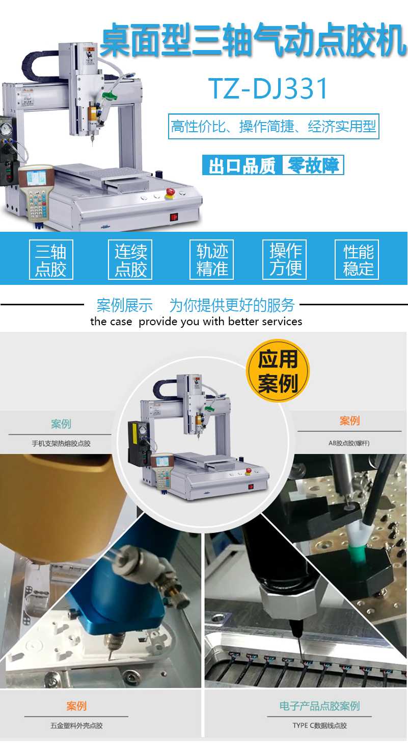 固科/Glueforce桌面型三气动点胶机TZ-DJ331 适用于工业生产的各个领域:手机按键、开关、连接器、电脑、数码产品、电子玩具、喇叭、蜂鸣器、电子元器件、电路板、LCD液晶屏、继电器、扬声器、晶振元件、LED灯、机壳粘接、光学镜头、机械部件密封.